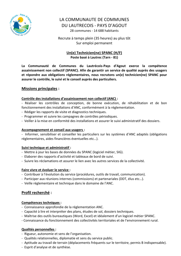 Offre d’emploi technicien SPANC TC