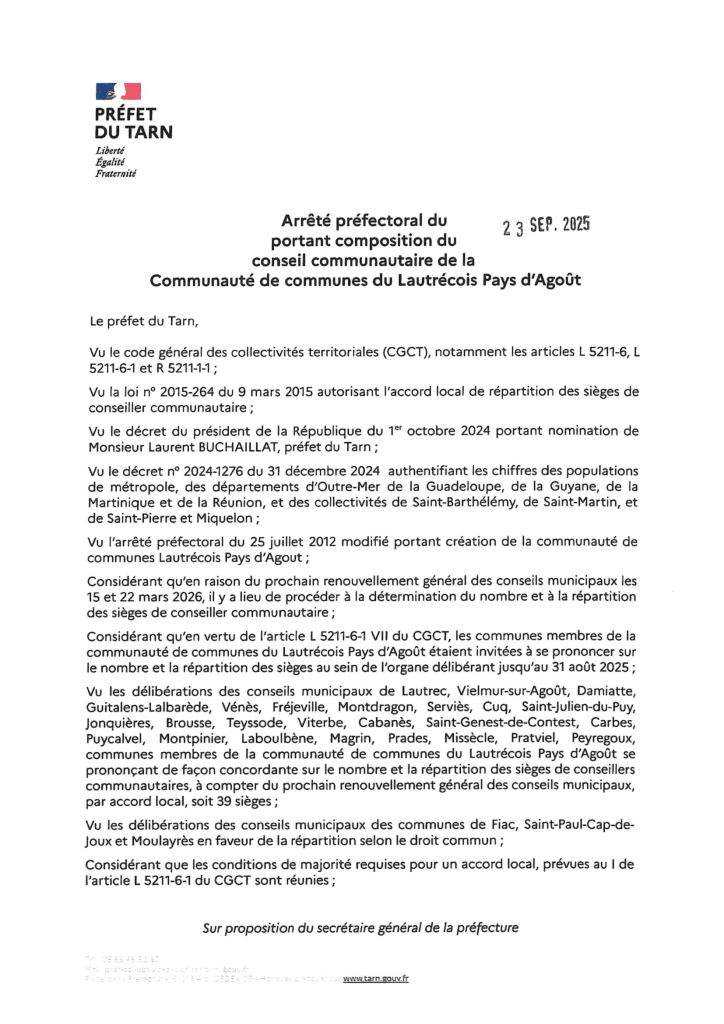 Composition du conseil communautaire de la CC du Lautrécois Pays d’Agout à compter du prochain renouvellement des conseils municipaux