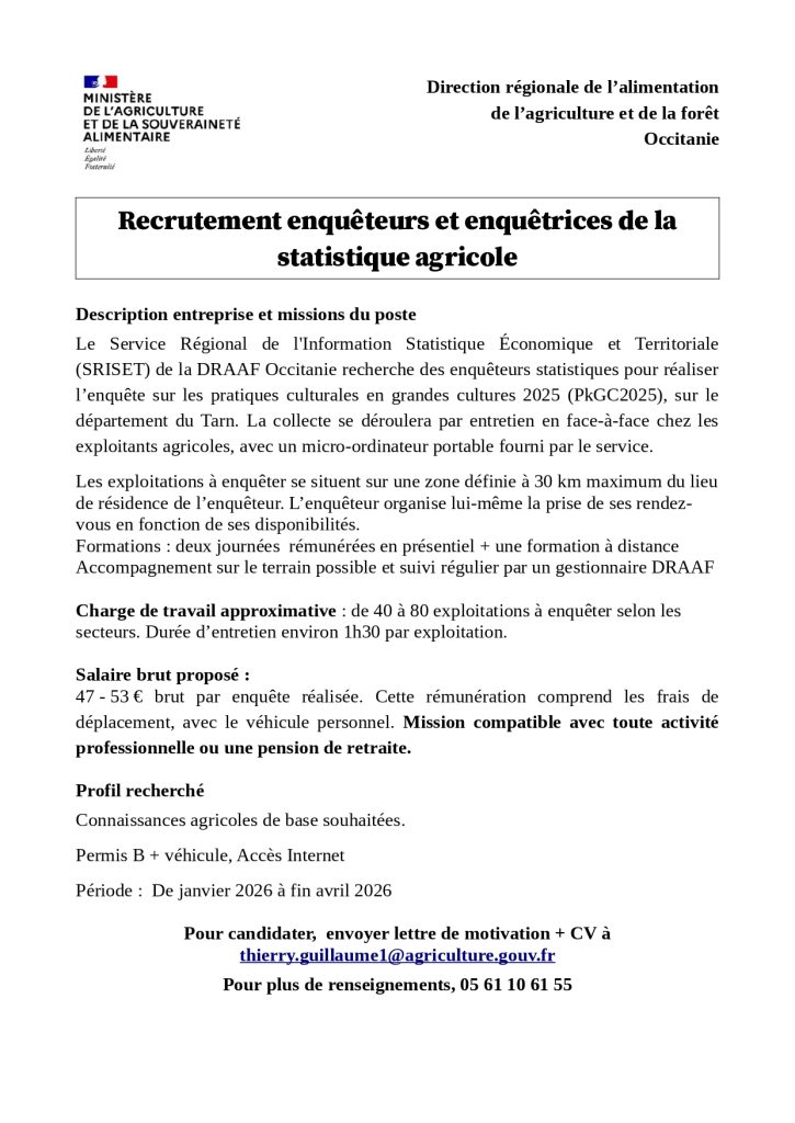 Recrutement enquêteurs et enquêtrices de la statistique agricole