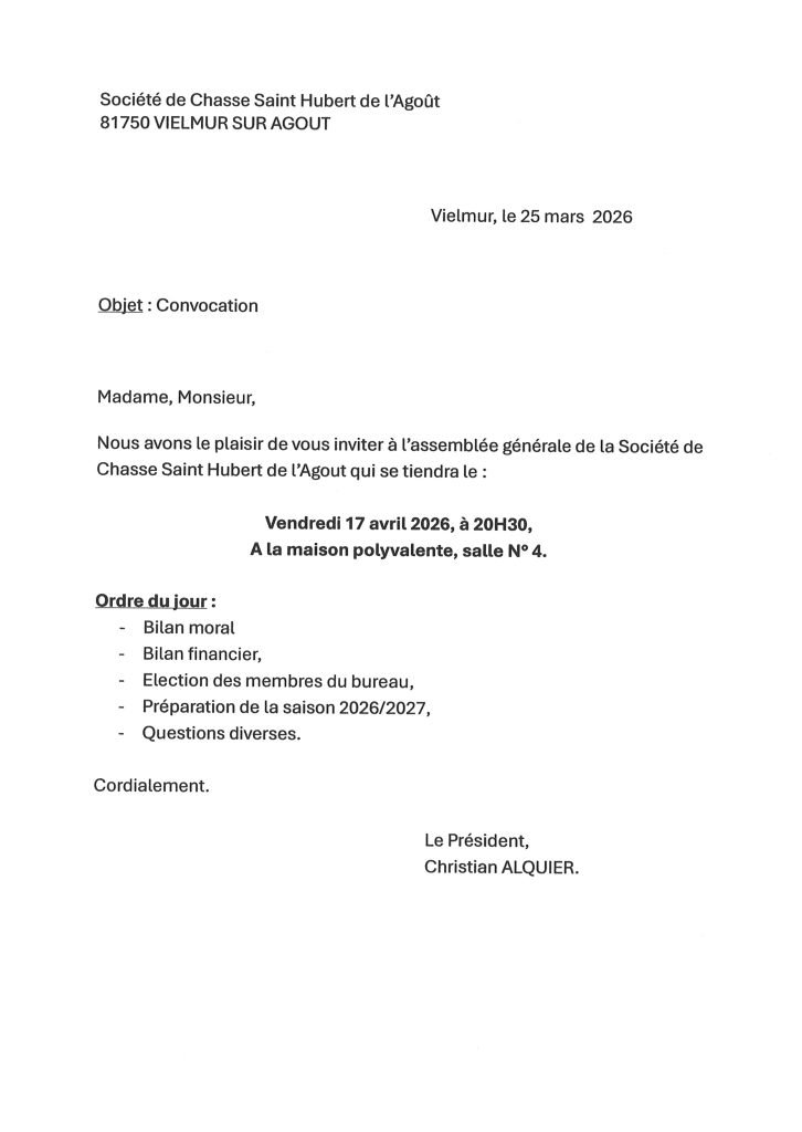 Assemblée Générale – Société de Chasse Saint Hubert de l’Agout