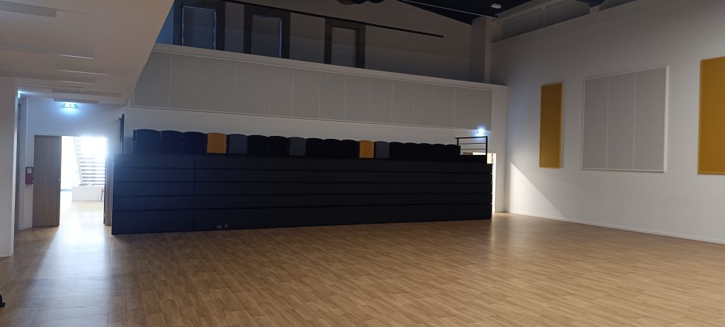 Elle présente l’avantage de communiquer directement avec la Salle 3, permettant ainsi d’agrandir l’espace en fonction des besoins.